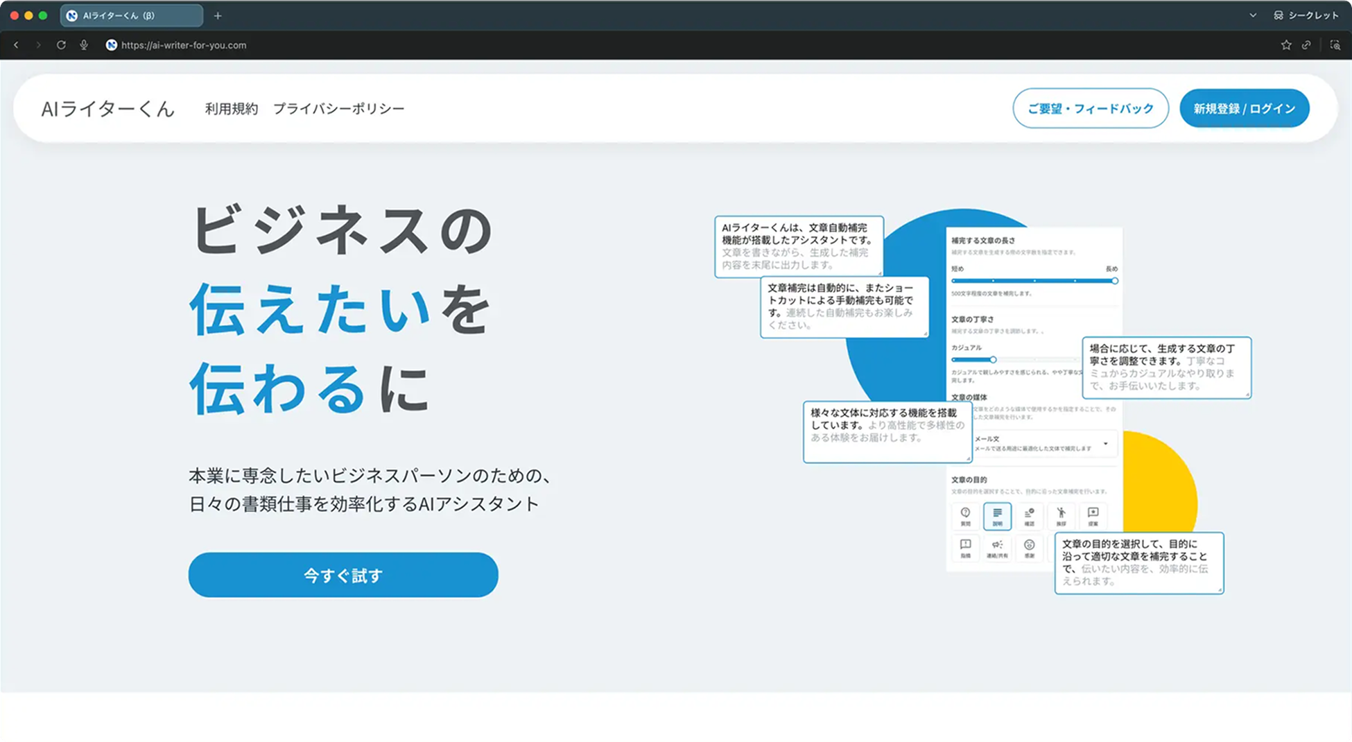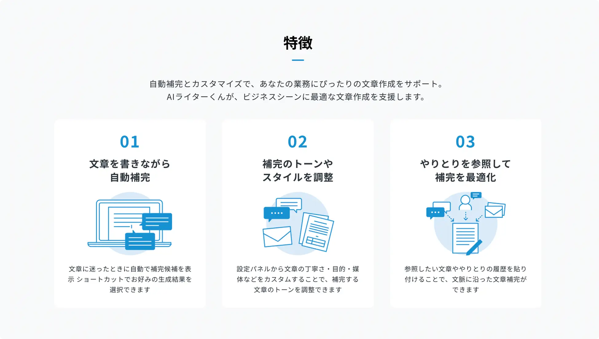 「AIライターくん」は、ビジネスパーソン向けにリアルタイムで文章補完(予測変換)を行うことができるツールです。