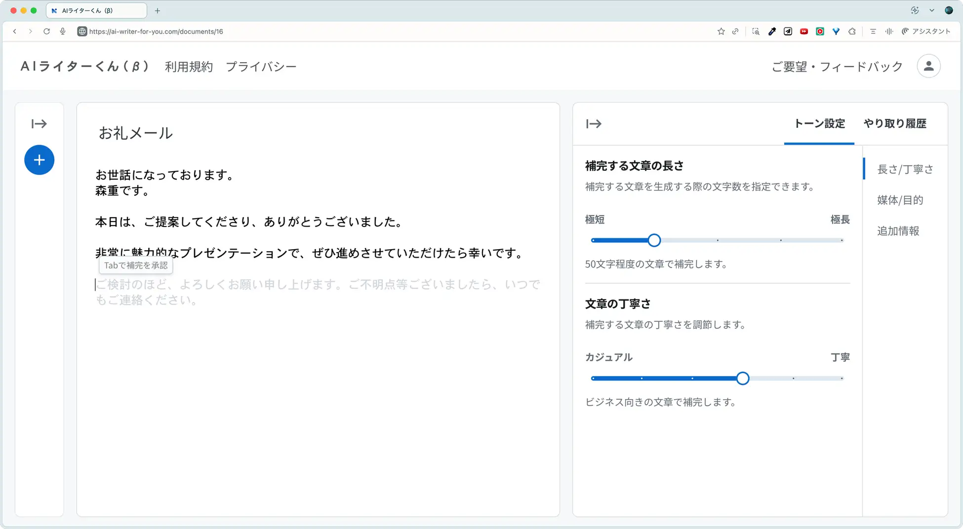 ユーザーの入力した文章の続きを「AIライターくん」が自動で予測・提案してくれるため、文章作成のプロセスそのものの大幅な効率化が期待できます。 また、「AIライターくん」が補完する文章の長さや丁寧さをカスタマイズ調整することも可能です。
